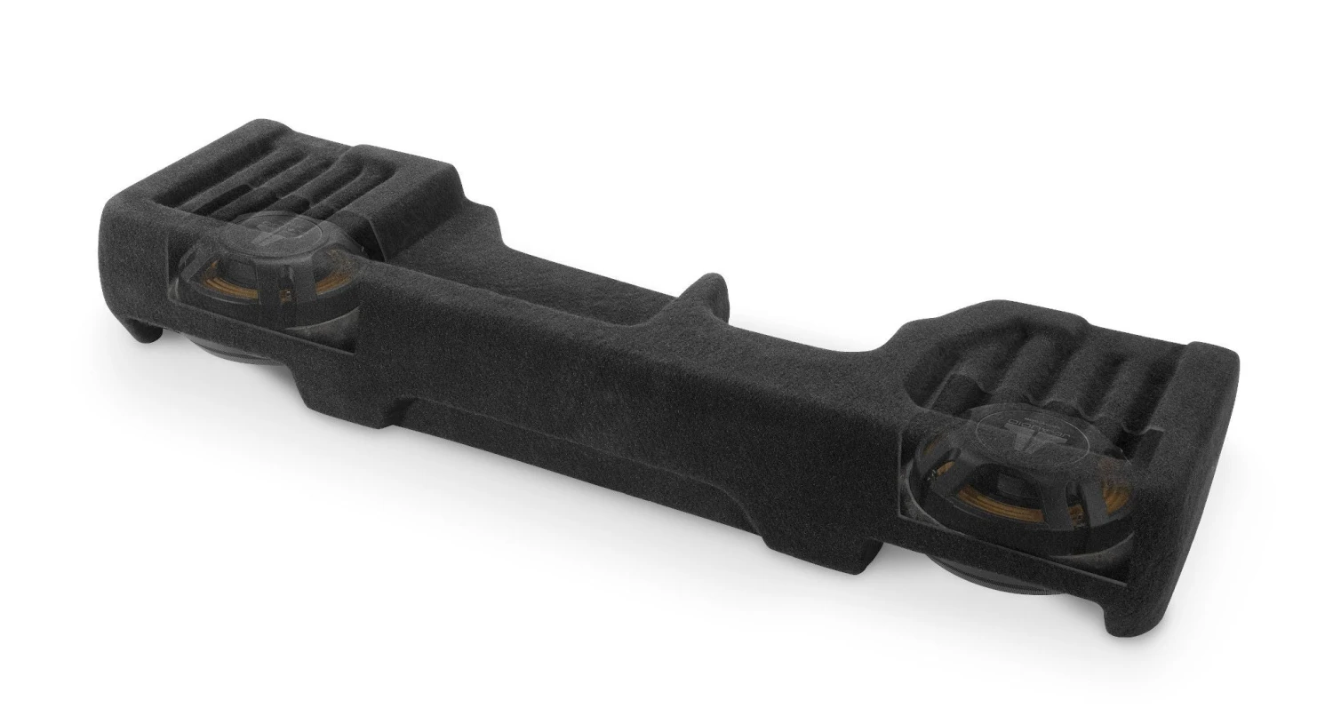 Fortunately, our engineers welcomed this challenge head on and developed a subwoofer solution that fills your Crew Cab with loads of deep bass output. Featuring an all-fiberglass, sealed enclosure design, this Stealthbox® houses two of our revolutionary 10TW3 thin-line subwoofers and installs neatly under the rear seat, without compromising rear seat comfort. Rear seat folding and recline are unaffected, and we even left a spot on the enclosure that’s perfect for a clean, hidden amplifier installation!